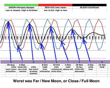 The full/new moon cycle is 29.5 days long. The far/close moon cycle is 27.55 days long. The spreadsheet graphs them both and also a third graph of their combined effect which is the most important. My personal health notes reveal that I am most negatively affected by the closeness of the moon when I am sleeping. Possibly this is universal,. I don't know. Please take your own health notes and then relate them to the 2023 graph and let me know the results. Click here to download the free spreadsheet. You can write to me (Michael) at a57ngel@yahoo.com |