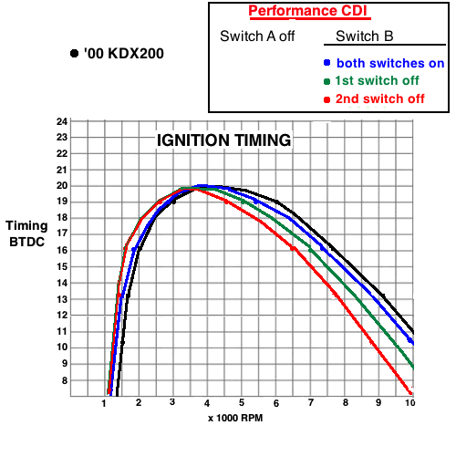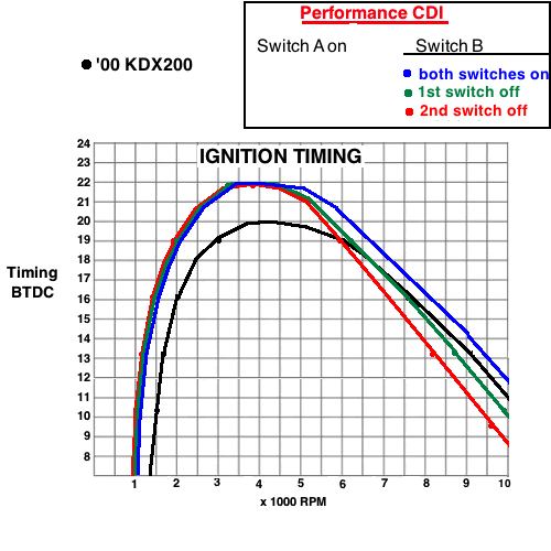 curves resulting from different B switch settings: ![]() Here is the timing graph showing the effect of switch A with the lever "on" (in the high position) and the 3 timing curves resulting from different B switch settings. More advance at lower RPM is usually gives better power although most riders don't ride at less than 4000 RPM. The advantage to having more low RPM advance is causing a more rapid timing curve change as the RPM increases which is more ideal. ![]() I think that the 2nd graphs red curve is the best of all of them but of course you can't know for sure without experimenting with each switch position. It comes new with that setting. If you want to keep it like the stock CDI then just put switch A off and both of switch B on. The more retarded the timing is at top RPM the higher the engine can rev but if it's too retarded the acceleration is less than it could be. |