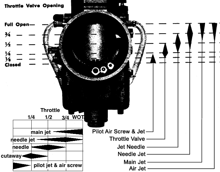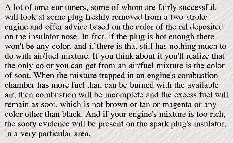 The Most Common Myths: 1. The old carburetor jetting charts are accurate2. 32/1 is the best fuel/oil ratio 3. a medium brown/tan color spark plug indicates correct jetting 4. small carbs limit power by restricting air flow 5. 1+1/2 air screw turns out always indicates the best idle jet size 6. you can balance a crank using the balance factor method 7. the engine size is what the manufacturer says it is 8. reed valve engines are faster than piston port engines 9. Fuel/Oil ratio changes affect gasoline % significantly 10. the air/fuel under the squish band burns too late to contribute to power 11. Piston Port Causes Rich Jetting Due To Intake Reversion 12. Engine Oil Type and Amount Only Affects Lubricity Carb Charts Here's what Mikuni had in their old manual which shows the main jet not having any influence below 1/2 throttle, the needle jet not affecting idle, and the needle not affecting WOT. ![]() Now look at this modern chart based on modern jetting calculators and how much different it is. You can see that the needle width (in relation to the needle jet) and the main jet has an effect thru the whole range, how the needle taper angle affects all thru WOT, and how the slide cutaway affects thru 5/8 slide opening. ![]() Anyone could counter with "yeah but your jetting calculator could be wrong" which is a good counter argument. But my source of information comes from my own experience, the experience of others, and feedback from Jets-R-Us and SUDCO. If you don't believe me then ask them. Or do your own tests like sealing the main jet with silicone sealant (easily removed later) to see how much that change affects the engines ability to idle. Or change your needle for one with a different taper and see how that changes WOT jetting. Or take out the main jet and see how 1/2 throttle jetting will become too rich. OIL RATIO The correct amount of oil needed depends on oil viscosity, max RPM, type of cylinder cooling, and type of riding. Listing one recommended oil ratio is complete nonsense. There are generally 3 types of oils: moderately refined petroleum oil, synthetic oil, and a semi-synthetic blend of the two types. A typical ratio for petroleum oil is 25:1 and a typical ratio for synthetic oils is 50:1 but this too is variable depending on the important factors. Semi-synthetics vary way too much to suggest a "general" ratio for them although they are typically between 30:1 and 40:1. Click here to read all about 2 stroke engine oils and the oil ratio calculator I created. And if you think one ratio is best because it provides sufficient ring sealing then consider the fact that some oils evaporate off hot rings faster than others and so leave less oil on the rings. So a fully synthetic oil at 45:1 is usually as good at ring sealing as a semi-synthetic oil at 35:1 because it's less evaporative (higher flash point temp). PLUG READING Because jetting depends on type of engine cooling, engine compression, and type of riding then the color actually is of little importance. Pros go by the size of clean areas on the piston top near the transfers and boost port, and to be double sure they aren't risking a seizure they also look under the piston crown to make sure there isn't much oil burned black there. Click here to read my full report on this subject. ![]() Hell, decades ago Jennings told everyone you can't read plug color to jet by. [article] ![]() He went on to say that the soot left at the base of the ceramic cone can only tell you if the jetting is too rich, that you can't use that to precisely choose a main jet for the carb. CARBURETOR SIZE Small sizes don't limit flow by their size but they increase the air velocity thru them. How fine the fuel particles become due to the shearing effect of the speeding air around them is determined by carb size. Perfect combustion at peak power RPM is dependent on a number of factors, including fuel particle size. So the smaller the carb is, the lower the RPM is that it benefits. So size is not a question of flow limitation but rather of fuel atomization dependent on air velocity. To read more click here. ![]() Air Screw Adjustment Most of the main carburetor manufacturers do not emphasize a certain number of turns out, but rather emphasize that you try different idle jet sizes to find the one that allows good idling and also good power before 1/2 throttle. So please don't get stuck on "1+1/2 turns". That is as silly as going by plug color for jetting. Click here to read more. This is from the Mikuni VM manual: ![]() BALANCE FACTOR This is not even a method for finding out what is needed. It's just a way to convey to others what to do for the same crank to get your same good results. To prove this I asked a "balance factor expert" what balance factor he'd recommend for a couple different engines, giving him full details. The answers I got back were way off. I knew they were off because these were two engines I had balanced using my crank balance calculator which doesn't use balance factor to find the right balance. [read more] But it does display what the resultant balance factor is, just for reference. ![]() True Engine Size Unknown to most is that the engine size formula for 2 strokes is not for 2 strokes. It comes from 4 strokes and uses the swept volume of the piston. But for a 2 stroke the trapped volume is the combustion volume, and that is what is above the exhaust port. So be careful to not raise the exhaust port much because you are lowering the actual working engine volume which becomes apparent below the pipe powerband as power there will decrease. Yes I know that inside the pipe powerband the return baffle wave increases the trapped volume but we can't easily measure that, but we can measure the area above the exhaust port. An engines purpose is to change fuel into working power. So why don't we size an engine by its working volume of fuel/air, the trapped volume? On a typical engine if you raise the exhaust port for a duration of 200 from a f