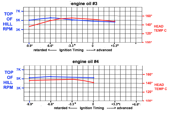 These two clues prompted me to test the differences between oils regarding best timing: 1) when lit on fire synthetic oil makes the smallest flame and mineral oil makes the largest flame which means they have different flamability 2) when analyzing the molecular composition of petroleum products the range is from very low carbon chain molecules of gasoline, to group 1 mineral oil, then group 2, then group 3, then groups 4 and 5 (synthetics). This chemical analysis gives backup to the first observation. So there's a long street uphill in my town which keeps my air cooled 48cc from reaching top RPM and so I got the idea of adjusting the ignition timing to see which timing gives the best uphill RPM (best power). I have an adjustable CDI of my own design. The result showed a maximum difference of almost 7 degrees between one type and another. This means: 1) When changing engine oil type you need to retest for best timing for best peak power or best powerband. 2) it's possible that the best power can be had by using a fast burn oil with a high RPM engine, and a slow burn oil with a low RPM engine. Engine Oil Types: Fully mineral oil, Synthetic/Mineral blend, Fully synthetic, Synthetic/Castor blend, Fully castor oil. Here's the graph results of the 5 main engine oil types. ![]() ![]() ![]() The difference in needed timing was 3.3 degrees between #1 and #2, or #2 and #3/#4. The difference in needed timing was 6.6 degrees between #1 and #3/#4. So if you have adjusted your timing to what you like best and you then switch type oil then by this info you know to also readjust your timing. For Example: Yamalube is mostly group 2 with 29% group 1, so if you switch from that "all mineral oil" to another type oil such as semi-synthetic then you know to recheck the timing. How To Set Ignition Timing: 1. Use a genuine NGK spark plug, not a cheap copy, of the heat range which you think is right for your engine which will be 1 or 2 #s higher than the stock recommendation if you have modded it for higher RPM. 2. Try different main jets and keep the one that is the biggest w/o causing any sputtering on slight downhills (when engines like lean jetting). If this causes sputtering mid throttle then lower the needle 1 or 2 notches. 3. Try different ignition timings, not changing it by more than 3 degrees each time. To know how far to move the stator coil plate (at its outer edge) for 3 degrees just multiply 0.0262 x stator coil plate diameter. If you ride mostly mid RPM then set it for best power there, and if mostly riding high RPM then set it for best power there. 4. Then look at the spark plug to see where the color change line is on the ground electrode. If closer to the end than at the halfway distance (halfway along the electrode) then the NGK heat range # is too high. And if closer to the weld point than halfway then it's too low. Click here to access my engine oils page which tells the % of each type oil in each engine oil. Engine Oils fully mineral oil: Amalie Pro 2T : 99% group 2 mineral oil Amalie SynPlus: 82% group 2 mineral oil Bel-Ray Mineral 2-Stroke Oil : 90% group 2 Bel-Ray SL-2 : 30% group 2, 35% group 1 Castrol Go!: 70% group 2, 20% group 1 Yamaha Yamalube 2R : 67% group 2, 29% group 1 PJ1 Goldfire Pro Racing : over 35% group 2, under 30% group 1 Spectro Oils 2T : 75% group 2, 7% group 1 Golden Spectro : 80% group 2, ~ 5% group 1 Oils with less than 30% group 1 oil: Mineral Oils Golden Spectro, Castrol Go!, Yamalube 2R, Spectro Oils 2T, PJ1 Goldfire Pro. Semi-Synthetics Motul 510, Motul Scooter Expert, Motul 710, Motorex Cross Power, Repsol Moto Off Road, Maxima Premium 2, Lucas Semi-Synthetic Oils with less than 21% group 1 oil: Mineral Oils Golden Spectro, Spectro Oils 2T, Castrol Go! Semi-Synthetic Oils Lucas Semi-Synthetic, Motorex Cross Power, Maxima Premium 2 Mineral Oils with no group 1 oil: Amalie SynPlus, Amalie Pro 2T, Bel-Ray Mineral Oil. Semi-Synthetic oils: Putoline MX5, Castrol A747, Red Line AllSport (not recommended due to 60% group 1 oil), Lucas semi-synthetic, Royal Purple HP 2-C, Maxima Premium 2, Motul Scooter Expert, Amsoil Interceptor, Amsoil Dominator, Putoline MX9, Motorex Power Synt, Motul 710, Motorex Cross Power, Motul 510, Maxima Scooter Pro, Castrol Power 1 Racing, Maxima FORMULA K-2 (7.5% mineral oil), Motul 800 2T Off Road and Road Racing (6% mineral oil) Fully Synthetic Oils: Maxima Super M, Bel-Ray H1-R, Silkolene Comp 2 Plus, Silkolene Pro 2, Castrol Power1 XR 77, Klotz R-50 Techniplate, Honda Pro Honda HP2, Motul Kart Grand Prix, ELF HTX 976+, Repsol Moto Racing 2T Synthetic/Castor Oils: Maxima CASTOR 927, Silkolene Pro KR2, Penrite 10 Tenths Race Castor Fully Castor Oils: Klotz BeNOL, Dumonde Tech Racing Castor, Blendzall Ultra Racing Castor |