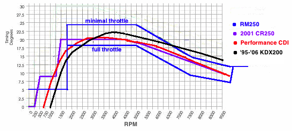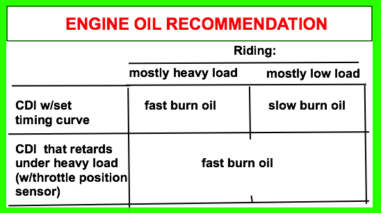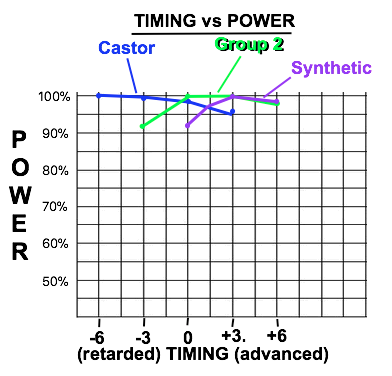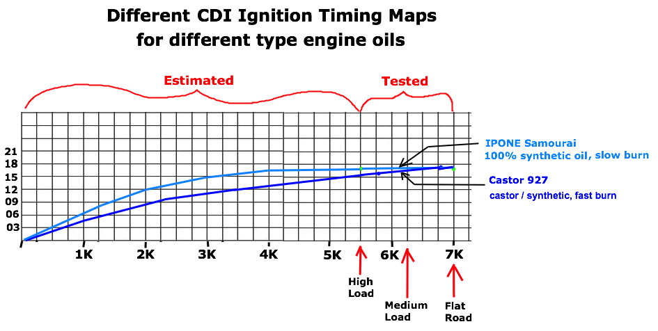 I retested the two most extreme oil types, the fully synthetic and the castor containing oils. Each was tested for best timing for best speed on nearly flat road, slightly inclined road, and road with a fairly steep incline for my small engine which represents a "high load" situation because it caused a continual decrease of RPM down to about half speed (but I noted engine speed along a telephone pole where the speed had only decreased about 750 RPM). Note at the lower right section of the graph below the three zones of engine load. Notice that the fast burn oil (the one with castor) needed less timing advance at the "high load" zone. This agrees with my previous tests. Ignition timing curve My engine doesn't need timing retard because it never gets above 7000 RPM and it doesn't have a squish band in the cylinder head which would speed up the rate of combustion as RPM gets into the high RPM zone (thus needing some retard). High load can include hill climbs, mud and sand runs, and even heavy acceleration common to racers. Many racers have self adjusting ignition systems which retard timing during heavy load but many do not. Someone with a self adjusting CDI should only use fast burn engine oils. People with CDI's that don't retard the timing under high load should use slow burn engine oils. ![]() Look at how this timing curve of a Suzuki RM250 adjusted the timing downward (more retarded) when the sensors indicated the rider was going thru a "high load" situation of WOT and less than peak RPM. I would guss that the fast burn oils match that CDI timing the best. Notice how almost all recommended oils for motocross bikes are "fast burn" semi-synthetics that have both group 1 mineral oil and synthetic oil (for example the Motorex oils that KTM recommends). ![]() If you want to know what any popular engine oil has in it just look it up on my oils page and if it's not there then try to find its safety data sheet on-line and notice the CAS # of any oil in it and then look that # up on this page to know the oils group #. Engine oils with group 1 or castor are "fast burn", and "slow burn" oils are the full synthetics and the oils made of just group 2 oil. Here's my video on the subject: YouTube where you can comment what happened when you adjusted for oil type or what happened when you compared fast and slow burn oils on your ride with non-adjustable timing. Such feedback is needed for people to realize this area of fine tuning. ![]() Retesting Oils March 30 2024 Science is based on observation and repeatability so I redid the tests. The different needed timings for different types oil remains unchallenged but I had drastically different head temps, so much so that I advise disregarding everything I said about oils affecting head temps (assuming the timing is right for the oil). All the temps were within a few degrees of each other. Of course there is still some measurement variability due to using an infrared thermometer and it all depends on how many seconds after letting off the gas it takes to measure the temp at the base of the spark plug. I really need a gauge with its thermocouple as a big copper washer between the head and the spark plug. I had one but its thermocouple broke. Here's todays graph of my uphill tests. The most timing independent oil is castor, next is group 2 oil, and last is synthetic. Notice 6 degrees difference between castor and synthetic. ![]() |