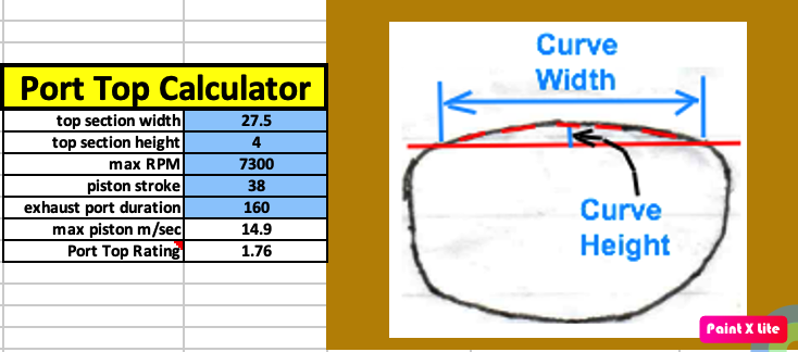 I used to think that the port duration was the most important factors when porting for a certain peak RPM. More duration equates to higher RPM. Everyone believes that and there are places on the internet that prescribe different port durations for different peak RPM. (That's good and I do the same but it's not the whole story.) I then compared two cylinders with everything the same except for the exhaust and transfer port durations. One had degrees duration of 141 exhaust and 114 transfers, whereas the other had 169 exhaust and 120 transfers. The blowdown time of millisecons between exhaust opening and transfers opening hopefully provides enough time for the exhaust gas to mostly leave before the transfers open at high RPM. If there is too little blowdown then that delays the entrance of the intake through the transfers at top RPM (although sometimes a delay isn't detrimental). ![]() Surprisingly, the one with the least port durations rev'd 300 RPM more (although it had weaker acceleration). The main reason probably was that when you raise the exhaust port you lessen the trapped engine volume, in this case from 45cc to 38cc. So the cylinder with 141 degrees exhaust duration had 17% more true engine volume than the other cylinder. The common formula for engine size was made for 4 strokes and is cm bore squared times cm stroke times .7854 which means it is ignoring the volume above the exhaust port so it's not a good way to figure engine size in a 2 stroke. The only true way to calulate it is figuring the volume above the port. Formula: cm bore/2 squared times 3.14 times (cm stroke above exhaust port + equivalent head stroke). Equiv head stroke = stroke above exhaust port (to TDC point) divided by (compression ratio -1). The second reason had to do with the upper port shape. The exhaust port with 142 duration had more of a squared-off shape at the top, and the other one was much more rounded. Thinking about it I realized that more open area at the beginning of the port opening not only increased the exhaust flow at the beginning, but also all the way till the transfers open. It's like each new open area for each new 5 degrees of crank movement (as the piston descends) incorporates that beginning area also. So I did a numerical analysis and the square port design actually had 12% more accumulative area than the other for the same beginning 5mm of piston descent (which equates to the 142/114* cylinders blowdown time). Here you can see how I modified the 169 duration port to get 500 more RPM: ![]() Then I began to wonder why there's so much paranoia about a near-square exhaust port design. People are so worried about the ring expanding out into the exhaust port that they always recommend a roundish design. But consider this: the rings are trying even harder to push outward into the transfers than they are into the exhaust port. That is because the rings at the exhaust are basically the middle of the rings and the sides of the rings are located at the transfers. When you squeeze the rings shut when installing the piston/rings into the cylinder notice how it's the sides of the rings that move toward the center point, not the middle of the ring. So look at how wide the transfers are at their straight tops and by that you know how wide a straight center portion of the exhaust port can be. So if you port for a target RPM and don't