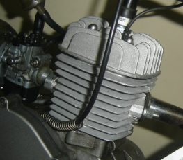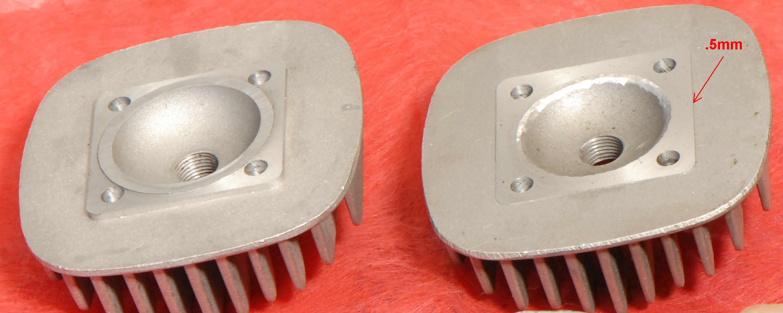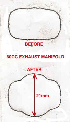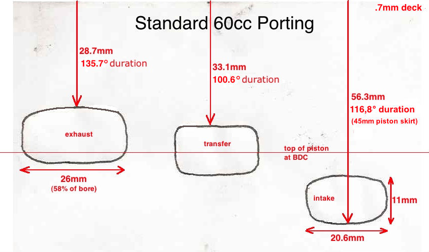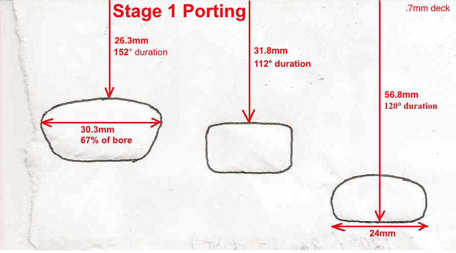 A new 60cc cylinder from Spookytooth Cycles fits right onto the cases of a 48cc Grubee engine and has the same bolt spacing for the intake and exhaust that the 48cc has. Here's its specs: .7mm deck, 135.7° exhaust duration, 100.6° transfer duration, 17.6° blowdown, 116.8° intake duration. ![]() It is a bolt on modification but I recommend you at least do these 3 thing to it: 1) use an exacto knife to trim the included base gasket to perfectly match the base of the transfer ports since it sticks into their flow area. 2) smooth the transfer port roofs which have a nasty lip which would disrupt flow at peak rpm. Just use a rotary tool with a grinding disc. 3) Use a rotary tool to grind off the crankcase interior at the transfers so that it better matches the cylinders bases of the transfers. Here's the specs on my test engine that I upgraded to 60cc: 14mm Dellorto carb with .6mm main jet, standard exhaust pipe with two small holes drilled into the end for less flow restriction, no .7mm head gasket, Jaguar CDI. The cranking pressure was 100psi and the top speed was 28.8mph (46.3km/hr) at 6530rpm. ![]() I choose to modify the engine in stages to see what it would take to get significant power increases. What I found out was that all you need to do for a power increase was to increase the cranking pressure. If you want speed increases then changing the porting is necessary. Here's the results of my testing: Stage 2 of the upgrade: I used the rotary tool to increase the port durations to 152° exhaust and 112° transfers and 120° intake, enlarged the exhaust manifold (see graphic), widened the intake and exhaust ports. With this there was a 3% speed gain to 29.6mph 6710rpm with the same broad range power. ![]() ![]() Stage 3 of the upgrade: I lathed 3mm off the head mating surface and installed the head gasket. This resulted in 120psi cranking pressure and 32.4mph (7340rpm) which was a 9.4% gain with better power throughout the rpm range. It was lathed till there was only .5mm "rise" in the mating surface. The unlathed head is on the left. ![]() Stage 4 of the upgrade: increase the cylinder port timing to 161° exhaust and 121° transfers with 1.2mm transfer ramps dremeled into the piston at a 60 degree angle from horizontal, increased main jet to .69mm. result: 33.2mph with good broad power Stage 5 of the upgrade: added 3 inches to intake tract using JNMotors offset intake and 2.5" hose for a total tract length of 7.5": 35.3mph (+6.3%) Stage 5 of the upgrade: install a lighter weight piston wrist pin with a 7.5mm inner diameter for better engine balance and less vibration. result: +2mph Stage 6 of the upgrade: install Rock Solid reed valve, hole the intake skirt of the piston, dremel boost port in cylinder. Stage 7 of the upgrade: replace standard exhaust with Jaguar Torque Pipe. |