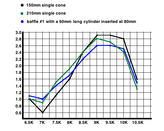 Looking at the following graph you can see that decreasing the baffle length (and subsequent cone angle) causes a gradual increasing of powerband. (In this example I am considering that the main powerband is the RPM range in which the power begins at 1.7 and ends at 2.2.) A shorter baffle yields a gain in peak power with the sacrifice of powerband length and power before the engine gets "on the pipe" (in the pipe powerband). I almost didn't even list the baffle angles because what matters the most is the baffle length. The same length will have the same relative effect on both a 100cc engine and a 250cc engine. But the same angle will result in different lengths and different effects. ![]() An easy way to extend the baffle powerband without losing too much kick at peak RPM is with an extended baffle which you can make by cutting your present baffle in two and then welding in a cylinder to match the diameter at the cut. 60mm long is usually about the right length for the extension. Make the cut at 55% of the cones length. (ie: if the baffle is 150mm long then cut it at 82.5mm) ![]() The pipe power graph below shows that a longer cone (with lesser angle) gives the broadest powerband but if you are converting a motocross bike into an enduro bike then it is easier to use a baffle extension than to fabricate a whole new baffle cone. Notice the more pronounced dip in power at 7000 RPM (1000 before the beginning of the powerband) of the short baffle. ![]() About a