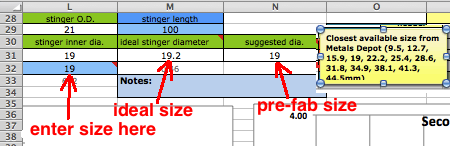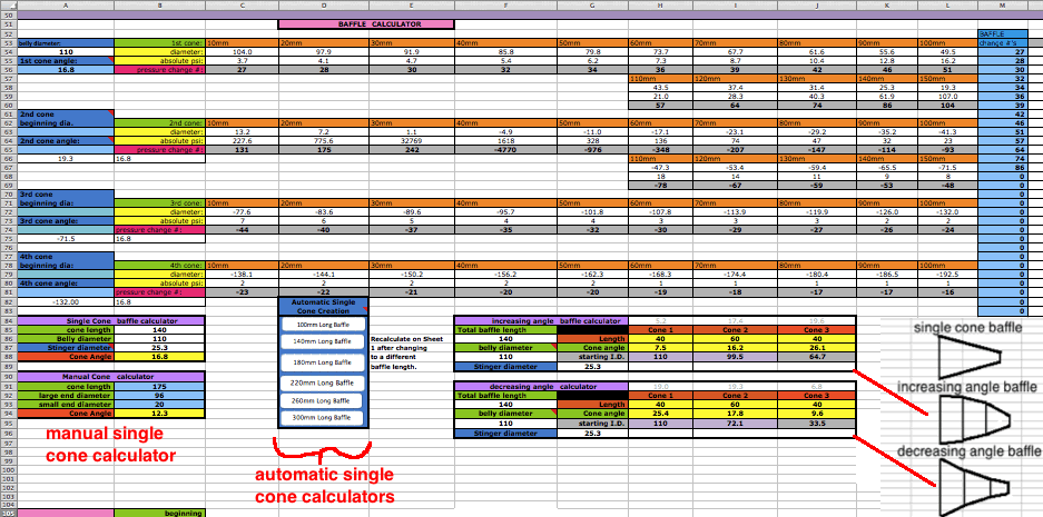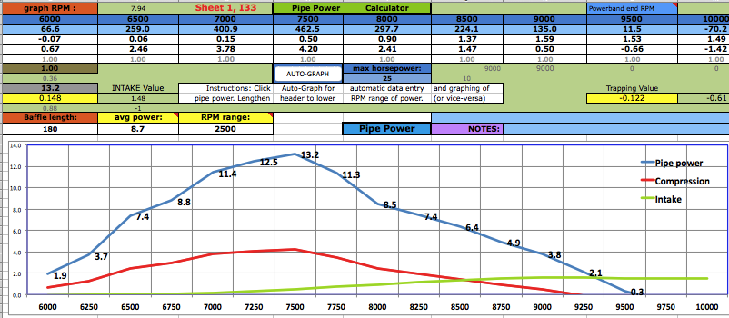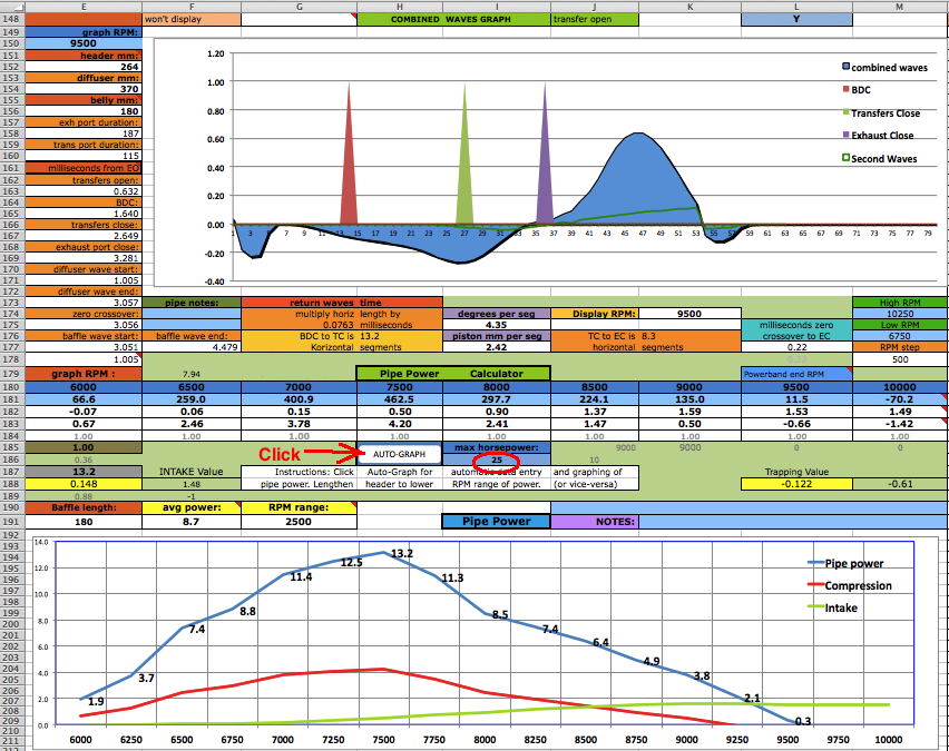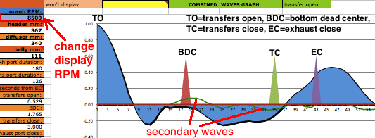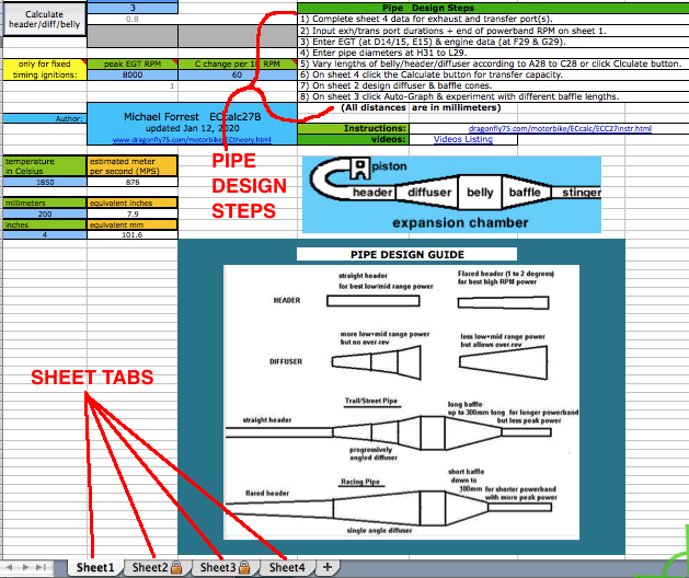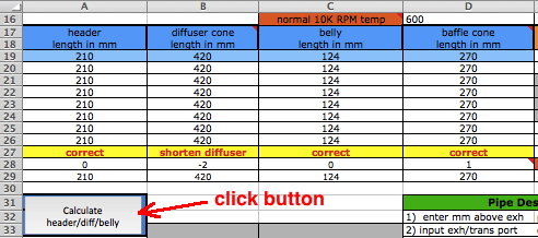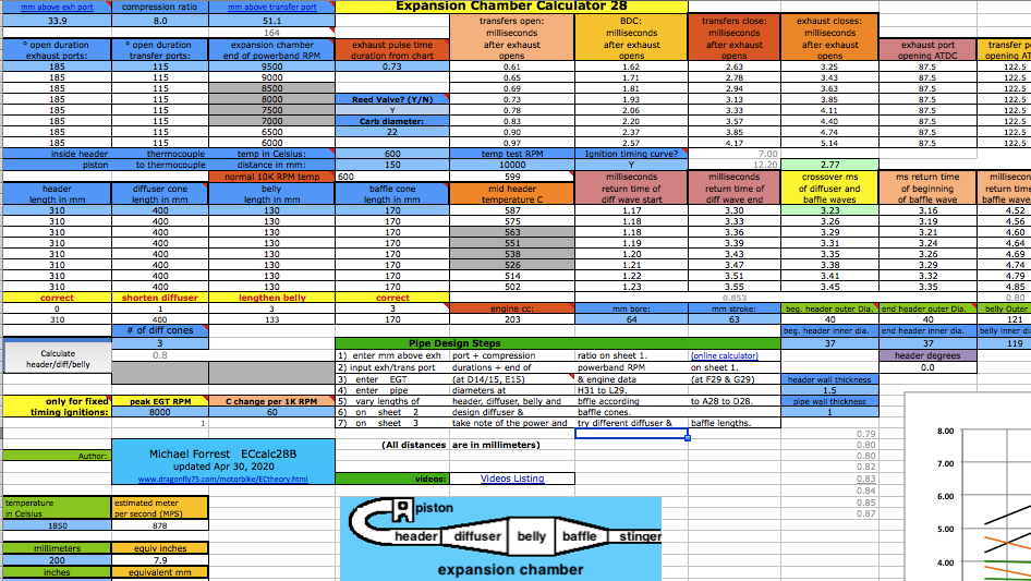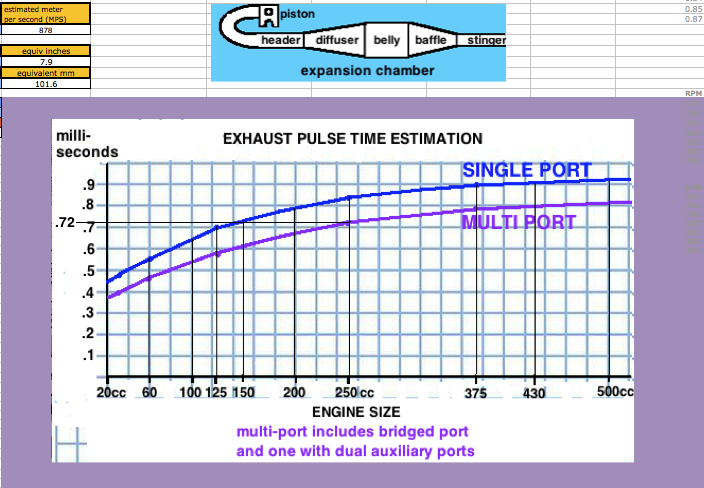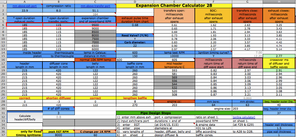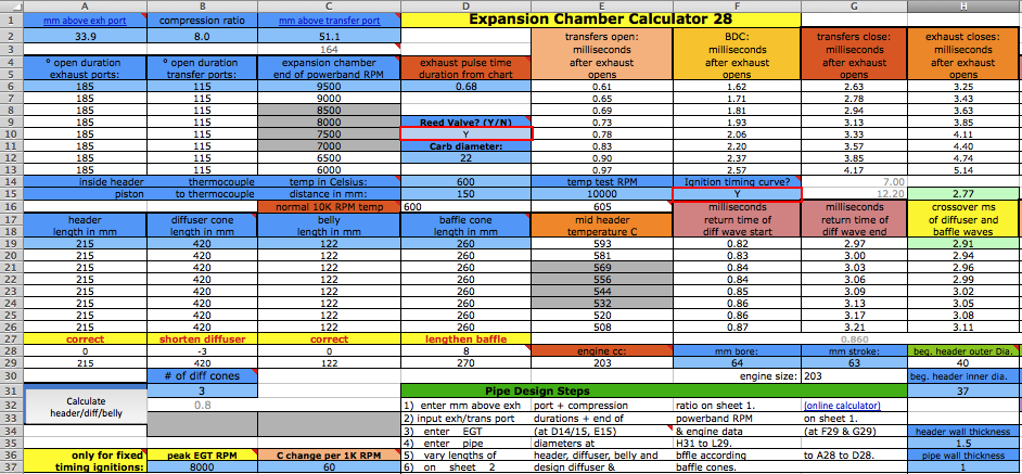 ![]() At D6 you need to enter an exhaust pulse time duration from the graph near the bottom of the sheet. For example, for a multi exhaust port 250cc you can see the time is .72 milliseconds. Getting this exactly right is impossible without the expensive pressure trace equipment that race teams use but you can get close here. That duration affects the time span of each of the the two pipe primary return waves. Anyway the difference between a .8ms and .9ms exhaust pulse is only a 5% width difference in the return diffuser wave so this calculators approximation is good enough. ![]() [In the following screenshots I often border the input cells in red that I'm talking about.] You'll need to know either the exhaust/transfers port durations or their distance from top of cylinder minus "deck" to the top of each port. Then use an online port duration and piston height calculator to find either the durations or the heights. Enter the port durations (read how to measure) and end RPM of the pipe powerband (at the end of being "on the pipe" which is usually about 750 RPM above peak power RPM) at C6. The RPM you enter at C6 should not exceed a 25meter/second piston speed on this calculator and a warning will display at D3 when it exceeds that. When entering RPM do not type in the comma. For example enter 9000 instead of 9,000. The port "duration" refers to how many crank degress the port is open each crank revolution. It's best to determine them by using an online calculator and the port heights (instead of using a degree wheel which is inaccurate because it's hard to see when the top edge of the piston is level with the top edge of the port). ![]() The RPM you enter at C6 corresponds to the very end of the pipe powerband, beyond where you would normally upshift. The graph below shows the end of pipe powwrband at 6750 RPM but most people would shift around 6600 RPM, just a few hundred RPM past the peak power. This example is for a 250cc motocross bike. Much longer powerbands are possible so it's best to just listen to the pipe and use that along with feeling the power to pinpoint the end of your pipe powerband. Then you can choose to stick with that or go a bit lower or higher. ![]() At D10 enter "Y" (for yes) if your engine has a reed valve intake or "N" if it doesn't. At F15 enter "Y" if your ignition system varies the ignition timing with RPM (like any normal modern CDI does), or "N" (for no) if it has fixed timing ignition (such as was on all old bikes such as the old Husqvarna and Maico motocross bikes). ![]() Enter the exhaust gas temperature in Celsius at D14, distance from piston to thermocouple at D15, and RPM at test temp at F14. If you don't know what it is then just use 600 at 10,000 RPM at 150mm. The best way to know the exhaust gas temp without measuring it is to ride the bike with a speedometer on it (which can be a bicycle speedometer) and note the speed when the bike is at peak power. Then use the gear ratio calculator to figure out at what RPM that happened. Then fill in all of sheet 1, 2 + 4 and on sheet 3 click the Auto-Graph button at H185 to see the peak power RPM. Then keep adjusting the temperature at sheet 1 D14 and clicking the Auto-Graph button till the peak power is at that RPM. Enter the engine bore and stroke at F29 and G29. ![]() How to use the Gear RPM Range Calculator: Go to sheet 3 and scroll down below the pipe power grapher to see the Gear RPM Range Calculator. A) Measure your rear wheels outer circumference: Push the bike till the valve stem is at the very bottom. Mark the ground next to the tire equal to where the stem is. Sit on the bike and roll forward till the stem is once again at the very bottom. Mark the ground there and measure the distance between the marks. If you measured in inches then put that value at J231 to know the equivalent distance in meters at K231. Enter the wheel circumference meters at G231. B) If you leave G229 blank then this calculator will use the end of pipe powerband RPM from sheet 1. Otherwise it will use whatever RPM you enter there. C) Put the bike in 1st gear. Take off your ignition cover and prop the bike up so the rear wheel is off the ground. Take the spark plug out. Spin the wheel till the valve stem is at a spot that you can easily remember (such as visually at the top edge of the swingarm.) Mark the flywheel and the cases so the two marks align. Slowly turn the rear wheel while counting the complete turns of the flywheel. Do this till the valve stem returns to its original position. A sloppier but easier way is to hold a pencil in the spark plug hole and count the times the piston hits it. Write down the crank rotations per wheel rotation and put that number for each gear from G237 to G242. D) Take note of the RPM spread in the K column of 2nd gear. Your pipes powerband should be at least that wide. To find out the RPM for a certain bike speed (KPH or MPH) just keep entering different RPM at G229 till the right speed is listed for the right gear. (the speed in a certain gear you experienced) ![]() Enter the stinger inner diameter. Choose between the ideal size at M31 and the available prefabricated size listed at N31. Look at the comment hidden at N30 to see common available inner pipe diameters for use as stingers (from Metals Depot): ![]() Enter the pipe inner diameters at H31 to J31. Enter the metal thicknesses at H35 and H37. All these dimensions are important to figuring out the approximate gas temperature inside the pipe which affects wave speed. The temperature decrease along the pipe is calculated by the outer area as the "dissipator" of heat. The max belly diameter at K31 is not a strict value but it's a good average max. ![]() Click the Calculate button for the right pipe section lengths to be entered into A19 to C19. If you need the header to be longer or shorter than what is calculated then just enter the desired length at A19 and then make up the difference at B19. Example: to increase the header length by 50mm