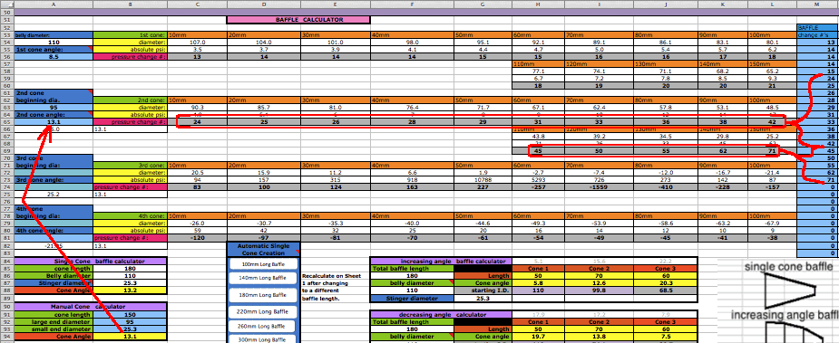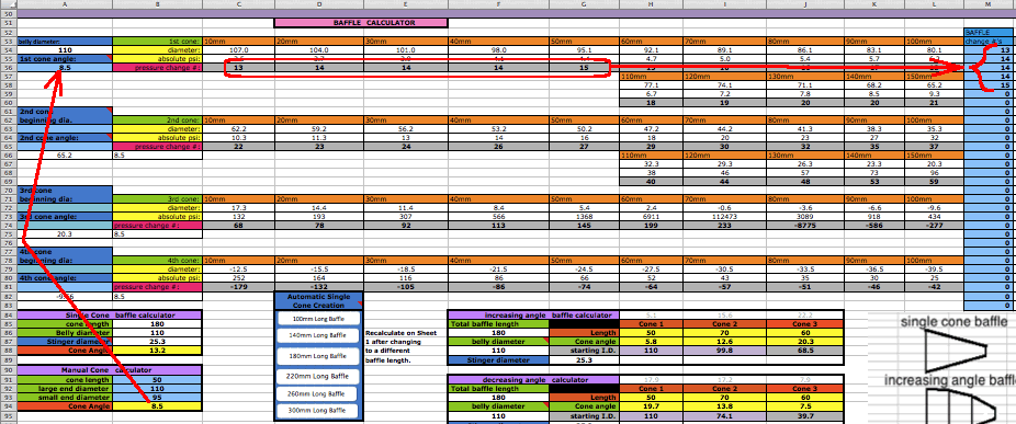 The whole point is to have the best pipe powerband (graphed power height and width). After entering the estimated peak horsepower at I186 just click onto the Auto-Graph button and the calculations will display the resultant pipe powerband below the return waves graph. ![]() Power Factors: The intake is determined mostly by the average height of the diffuser wave, how much of the time it occupies between BDC and TC, and the pressure at TC (negative is best). The compression is determined by the pressure at TC, EC, and slightly before EC. Those two graphs are added together for the resultant power. ![]() Trying Variations: It is good to record the results of the current pipe design and then try a couple variations and record each ones result. In this example I shortened the belly by 40mm and the power increased but it shortened the powerband a bit. (You can't create energy, just move it around). You can change the diffuser length on sheet 1 to move the powerband up or down on the RPM scale. And changing the belly length will change the powerband shape a bit. If you add 20mm to the belly then subtract the same amount from the diffuser. If you've selected manual diffuser design on sheet 2 then you need to re-do it there after any diffuser length changes on sheet 1. ![]() With your pipe design finished you can go to sheeet 4 to know how to cut out the patterns from poster paper which you can then trace onto the sheet metal (.7mm or more thickness) before cutting it with tin snips. You'll need an extra long ruler. This sample pipes data has been entered in the cone making section below for you to see how its done. ![]() Every diameter needs the sheet metal thickness added to it which is done for you at A38 to C41. Just enter those values into the light blue cells above that section if your design has a 3 cone diffuser and single cone baffle. For any other design then just ignore A38 to C41 and make sure you add in the sheet metal thickness to all the pipe diameters you enter starting at A29. After entering the data in the blue cells then use the calculated data at D29 to H34 to draw the graphics pattern on poster paper. The gray area of the graphic is the pattern to be cut out, laid on sheet metal, and traced around with a felt marker so you can cut out the cone section with your tin snips. Each of the 6 rows (29-34) are for a separate cone. ![]() You can also use the Cone Layout software from this site which has the added advantage of making the cutout patterns for more complex designs. Questions & Answers What is the most import guideline for designing a diffuser? Make it 3 cones if it's for a reed valve engine. It makes a big difference. What if the available space for the belly is less than the recommended belly diameter? Just make do with the available space. But the wider the belly the more power it will contribute. What if I design a pipe with a belly diameter greater than the recommended max? No problem but as you go much beyond it then you may need to use a decreasing angle baffle. What happens if my design varies from the suggested lengths on sheet 1? I encourage every one to experiment with variations from what is recommended to get the absolute best power. But usually what is recommended is very close to ideal. What if the recommended pipe section lengths on sheet 1 are impossible for the space available on my bike? Well then you'll have to change the lengths to match the bike. Bike designers have always had that problem. If the designed pipe is longer than the available space then consider raising the end of pipe powerband RPM so the design will be shorter. On my bike I had to use a 2 cone diffuser design due to space limitations. Can I just make the diffuser a single cone? Yes but it won't have an ideal 'delayed' wave peak which is needed for optimal power. Maximum effort at making a great pipe is essential if you want the best power. Don't be lazy and take shortcuts. What recommendations can you give for designing a pipe for a bike for a beginning rider? For a beginner you might want a pipe that gives as little "hit" as possible. You can do that by making the belly width smaller, the belly longer (and the diffuser shorter), and the baffle longer. Also you can design for the end of the pipe powerband to be about 1000 RPM below the normal end. It would make it more grunty like a trail bike. Also you can replace the base gasket with glue and add a head gasket, all to lower porting for less peak RPM. What can I do to get more pipe boost? If your pipe powerband is longer than what you want or need then you can shorten the baffle with steeper angles for a stronger but shorter return wave. Keep in mind that the wider the belly is the stronger the cone angles will be for the same cone length. Bigger angles mean stronger return waves. Also a 3 cone diffuser is very advantageous. Is there any advantage to a 1 degree flaring header? Yes if you can have a belly at the maximum width recommended or even more in order to keep decent angles of the diffuser cones. Dynos have proven that doing that produces more power. |