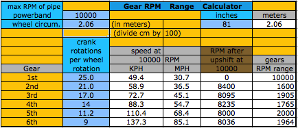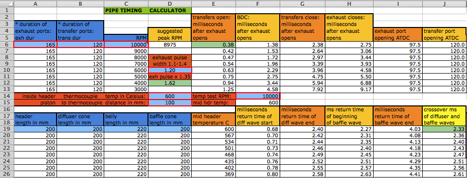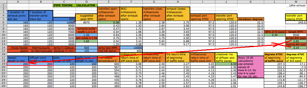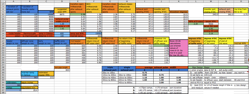 First you can use sheet 1 of ECcalc to get ballpark figures for the right lengths of header, diffuser, and belly so that after fine tuning with header and belly lengths on sheet 3 the combined return waves shown will sync with the port timing at the middle of the powerband like what you see here. Make the return waves horizontally positioned so that at 1,000 RPM below the top powerband RPM the peak of the baffle wave will be about 5/7th (70%) of the way from TC to EC. ![]() Here is sheet 1 where you will enter the basic engine data. Data entry boxes are in light blue. This section is also useful when porting an engine and trying to decide on the exhaust and transfer duration. Row 6 continues at row 19, row 7 at row 20, etc. The basic design steps are listed at the bottom right. To the left of it you can get an idea of what exhaust pulse duration (width) you should use. Getting this exactly right is impossible without the expensive pressure trace equipment that race teams use but you can get close. Anyway the difference between a 1ms and 1.2ms pulse is only a 14% width difference in the return diffuser wave. Sheet 1 can calculate for a pipe with any exhaust pulse duration but sheet 3 can only graph the return waves within a certain range of exhaust pulse durations. There are 3 versions of ECcalc. Use ECcalc12 for durations between .75ms and 1ms, ECcalc12b for 1.1ms to 1.4ms, and ECcalc12c for 1.5 to 1.8ms. The biggest effect of the exhaust duration is how much the diffuser and baffle waves overlap, so if you hate not knowing how close our guesstimate is then just make the belly adjustable in length. By trial and error you can get the best power and powerband once you get the correct wave overlap. ![]() Enter exhaust port duration* at A6, transfer port duration at B6, top of powerband RPM at C6 (not the over-rev RPM but the top of the meaty part of the powerband which is 2000-2500 RPM wide depending on the length of the baffle), exhaust pulse width at D10, inside-of-header temperature at D14, at D15 how many millimeters from the piston the thermocouple was located in the header, and at F14 the RPM at which the temperature was taken. (Without knowing the temp just put in these temps for these exhaust port durations; 575° C for 165° exhaust, 600° for 180° exh, 625° for 190° exh, 650° for 200° exh. Also make the thermocouple distance half that of the header length [and recorrect after changing the header length later], and make the test RPM the same as your RPM at C6). Take notice of the blowdown time at E6. A good target blowdown is .5ms if you are porting it. (* the "duration" refers to how many crank degress the port is open each crank revolution) ![]() Now set the baffle length according to how much "hit" you want (at the sacrifice of powerband width and with more power loss just before the powerband. read more). A normal range is 150-240mm. Then set the belly so that the values at J19 and L10 are very close. The right belly length is that which lets the diffuser and baffle waves to cross over each other just enough to shorten the diffuser wave a bit. ![]() Set the diffuser length at B19 (at least 160mm. read more). Double check your diffuser design on sheet 2. If you can't get all the % area changes to be less than 15% then make it of multiple cones or lengthen the diffuser till you can. Then set the header length so the values at M12 and M14 match. If this is a new design without an exhaust temperature measurement then in order to maintain the same intended mid-header temperature at F19 you will need to reset the thermocouple distance at D15 to half the length of the header after you change the header length. Then adjust the header length again if the values at M12 and M14 don't match. ![]() Unfortunately this last step of matching M12 to M14 only works with single coned baffles. If you have a multi-coned baffle design then complete the steps as normal and then on sheet 3 adjust the header length so that at 1000 RPM below the peak of powerband RPM the peak of the baffle wave (on the combined waves graph) is 70% from TC to EC. Then enter all the data for the power graph and if it needs to be adjusted left or right then do so with the header length. The following info only pertains to bikes that have more than a 2000 RPM spread between gears (such as 4 speed bikes). The baffle length determines what the RPM range of the powerband is so you need to know what the RPM spread is between gear changes on your bike. On sheet 4 you can see the gear/RPM calculator. First you need to know the rear wheel circumference (length around it). Position the wheel so that the valve stem is low center. Mark the ground at that same point. Sit on the bike and roll forward till the valve stem is again at lowest position. Measure that distance on the ground. If you measure in inches then put that number in K14 and then put the number from L14 in H14. Next find out how many crank revolutions per rear wheel revolution your bike has for each gear. Put the bike on a center stand so that the rear wheel is off the ground. Remove the magneto cover and make a mark on the magneto and on the cases. Remove the spark plug(s). Rotate the rear wheel 1 revolution and count how many crank revolutions there are. Put those numbers in H20-25. Put the powerband top RPM in H13. L21-25 will show the RPM range for each gear if you upshift when the bike reaches to top RPM of the powerband. Use the largest of those numbers from gear 3 on up as your target powerband. In this example it is 2000 unless you want to not be so precise in your shifting or want some power when lower than the pipe powerband. In this case a single coned baffle should suffice. ![]() Next Page |